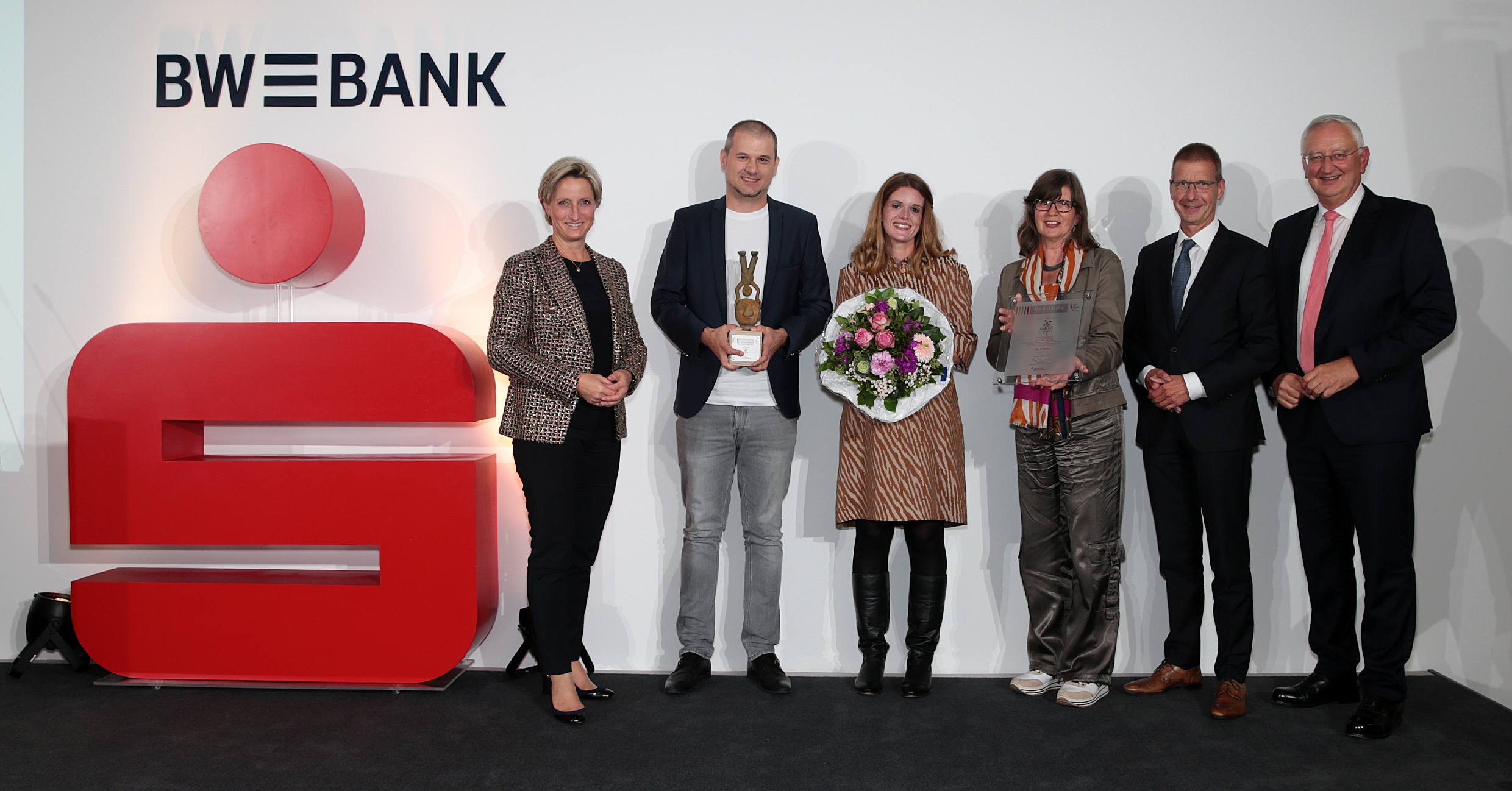 Wirtschaftsministerin Dr. Nicole Hoffmeister-Kraut und Sparkassenpräsident Peter Schneider ehren fünf Unternehmensgründungen, darunter ein Floristik-Geschäft aus Flein